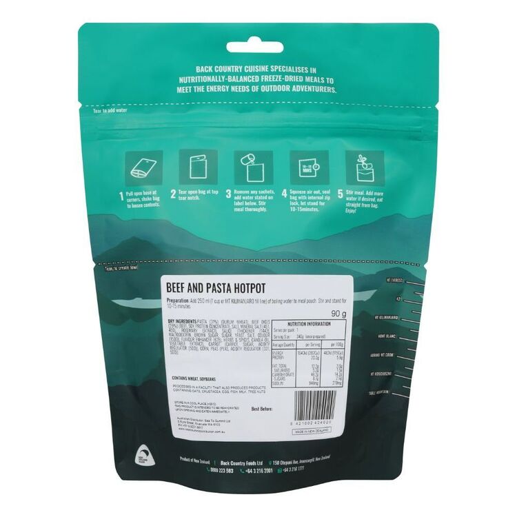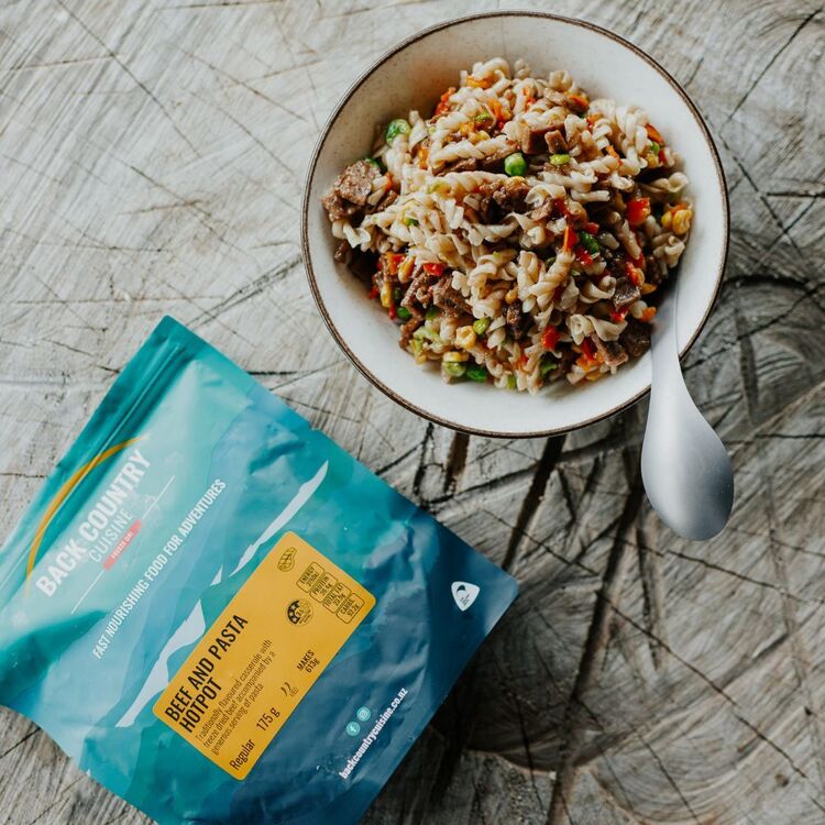 A sensational choice, the Back Country Beef & Pasta Hotpot will definitely satisfy the shrewdest critics. Back Country keeps on delivering great products at great value. Check out the full range today! Fast, nourishing food for adventurers. The Back Country Cuisine range of meals, desserts, meal compliments and complete ration packs are easy to prepare by adding water to the convenient pack. Back country Cuisine is great for all your outdoor adventures including mountain biking, hiking, hunting and fishing, yachting, adventure racing and expeditions. Traditionally flavoured beef casserole accompanied by a generous serving of pasta.