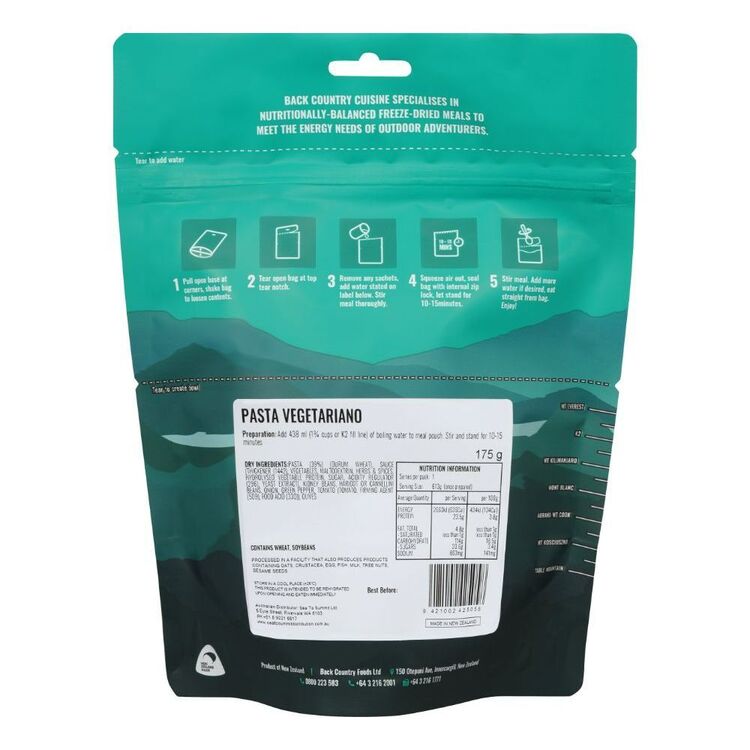 Fuel up with the Back Country Cuisine Pasta Vegetariano, a dish of pasta, beans, tomatoes and olives in a tasty Italian sauce. Back Country Cuisine products are easy to prepare and taste great, combining quick-to-hydrate, freeze dried vegetables and meats with delicious sauce mixes that retain their natural flavours, and can be prepared inside the pack in 10 minutes with just a bit of boiling water. Back Country Cuisine meals are formulated to meet the high energy needs of outdoor activity. They have a careful mix of the essential components needed for a healthy diet, including balanced carbohydrates and sugars for instant energy, protein to replenish exhausted muscles, and oils and fats to keep you feeling full.