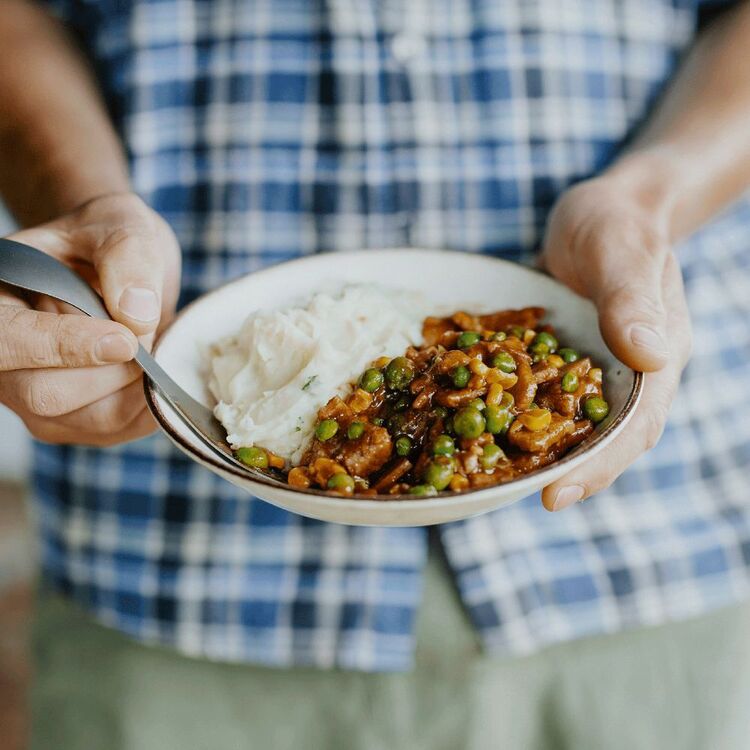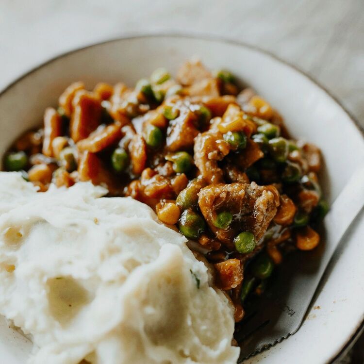 - Potato (Potato (contains emulsifier (471), stabiliser (450), sodium metabisulphite (223), antioxidants (304, 320)), canola oil, whole milk powder, sugar, salt, chives), chicken 22%[chicken, soy protein, salt, stabilizer (450, 451)], sauce [Maltodextrin, Thickener (1442), Potato Starch, Rice Flour, Salt, Yeast Extract, Sugar, Hydrolysed Vegetable Protein (Maize), Colour (150d), Dehydrated Vegetables, Yeast, Acidity Regulator (330)], stuffing (breadcrumbs, egg, milk, onion, herbs, salt), peas, corn.