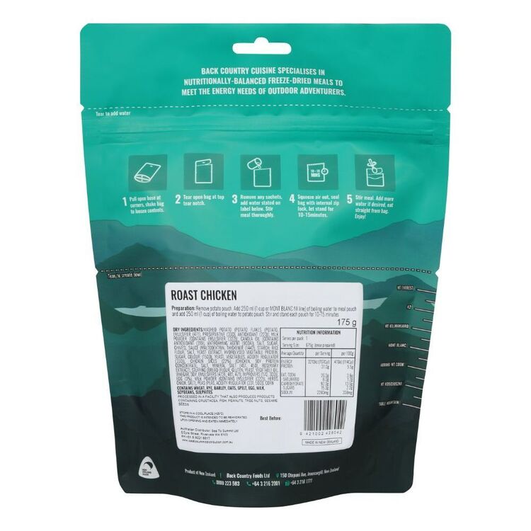 The Back Country Roast Chicken Double is a delicious meal of tender chicken dices, vegetables and stuffing smothered in gravy and served with mashed potato. The Back Country Cuisine range of meals, desserts, meal compliments and complete ration packs are easy to prepare by adding water to the convenient pack. Back Country Cuisine is great for all your outdoor adventures including mountain biking, hiking, hunting and fishing, yachting, adventure racing and expeditions.