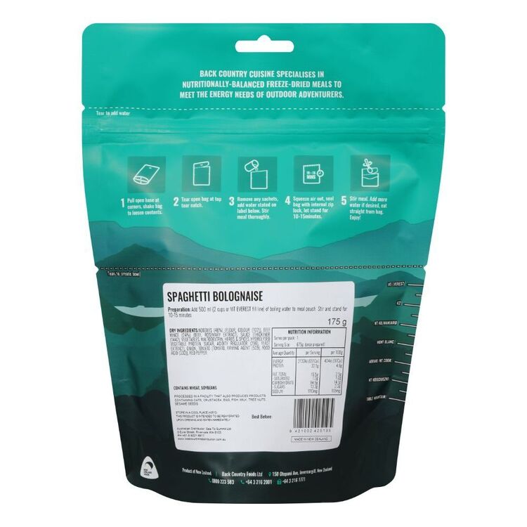 A classic choice, the Back Country Spaghetti Bolognaise is a delicious and convenient meal of tender beef mince with tomato in a savoury sauce, served on a bed of noodles. Fast, nourishing food for adventurers. The Back Country Cuisine range of meals, desserts, meal compliments and complete ration packs are easy to prepare by adding water to the convenient pack. Back Country Cuisine is great for all your outdoor adventures including mountain biking, hiking, hunting and fishing, yachting, adventure racing and expeditions.