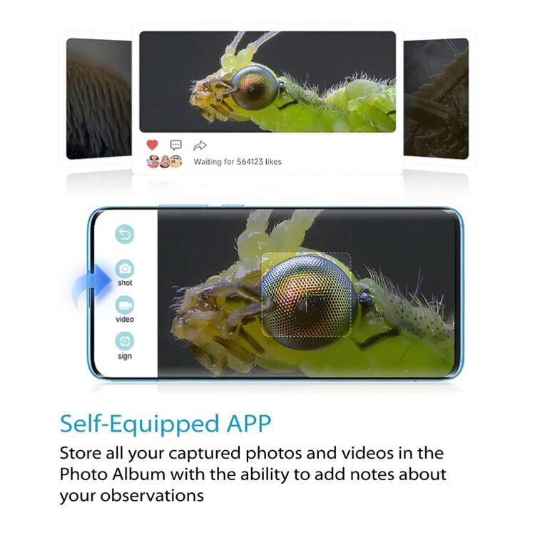 In this self-equipped app, the PHOTO ALBUM stores all photos and videos you captured before. The NOTES part allows you to create notes to record the information of your observation. These files can be shared anytime with your family, friends, or upload to your YouTube channels via smartphone wirelessly.