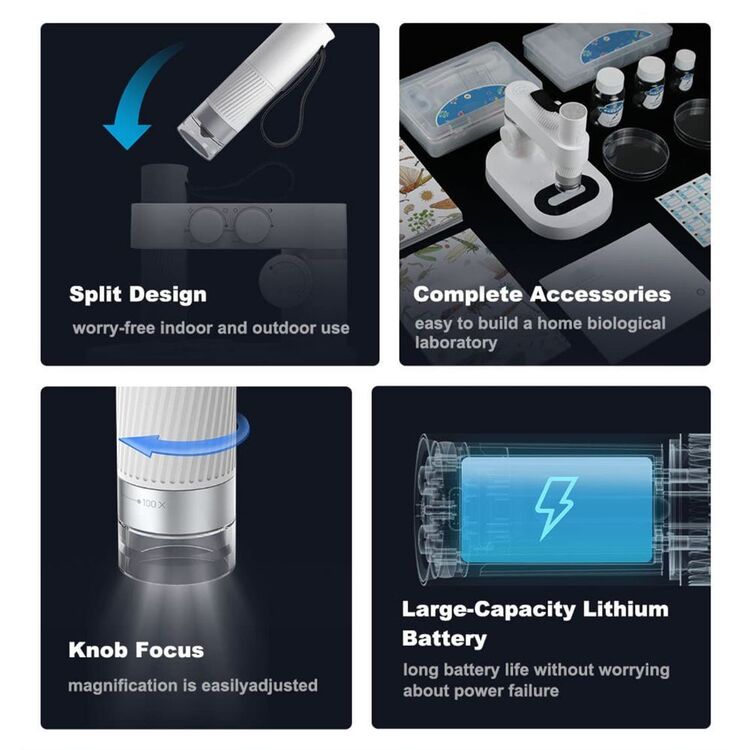 The Darwin M1 microscope adopts an innovative detachable design that enhances its usability in outdoor environments. With a weight of merely 100g and a height of 12cm, this highly portable microscope tube is the perfect handy tool for outdoor observations.
