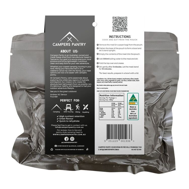 Don’t let setting up a fire slow you down on your journey, eat on the move with the Campers Pantry Single Chicken Cacciatore! This meal features juicy chicken pieces cooked in a rich and rustic tomato sauce with mushrooms, kalamata olives and rice. With the new compact lightweight expedition packaging, you’ll be able to save space and spice up your next adventure. With a shelf life of 5 years, you’ll be ready for any impromptu trip to come. Stock up on delicious dinners, desserts, snacks and lunches with the Campers Pantry range.