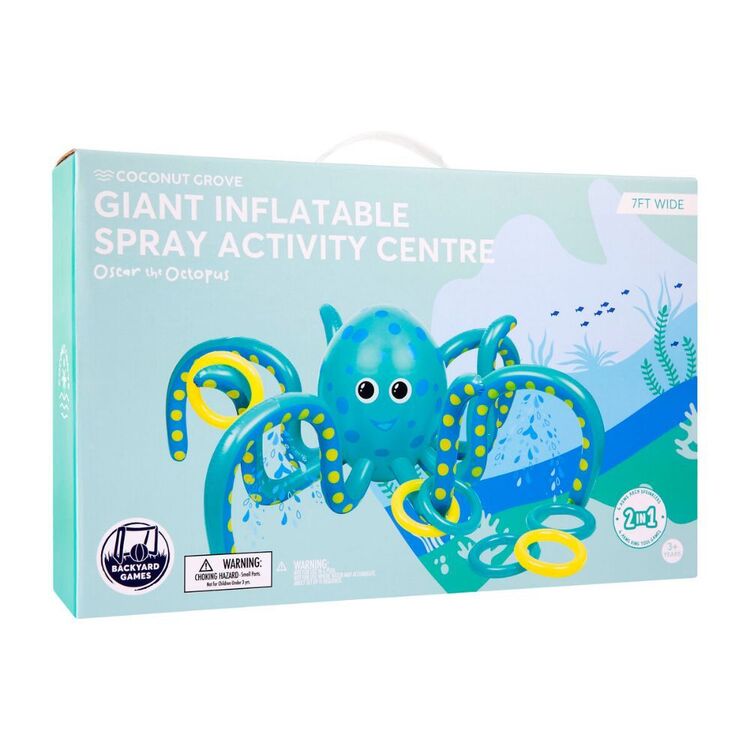 Grab your kids a fun and engaging game suitable for a range of ages with the Coconut Grove Oscar Octopus Inflatable Spray Centre. Made from a durable PVC material this activity centre is designed to withstand hours of fun. This eye catching game features a inflatable oscar the octopus inflatable activity centre, six inflatable rings and four ground stakes to hold it all down.