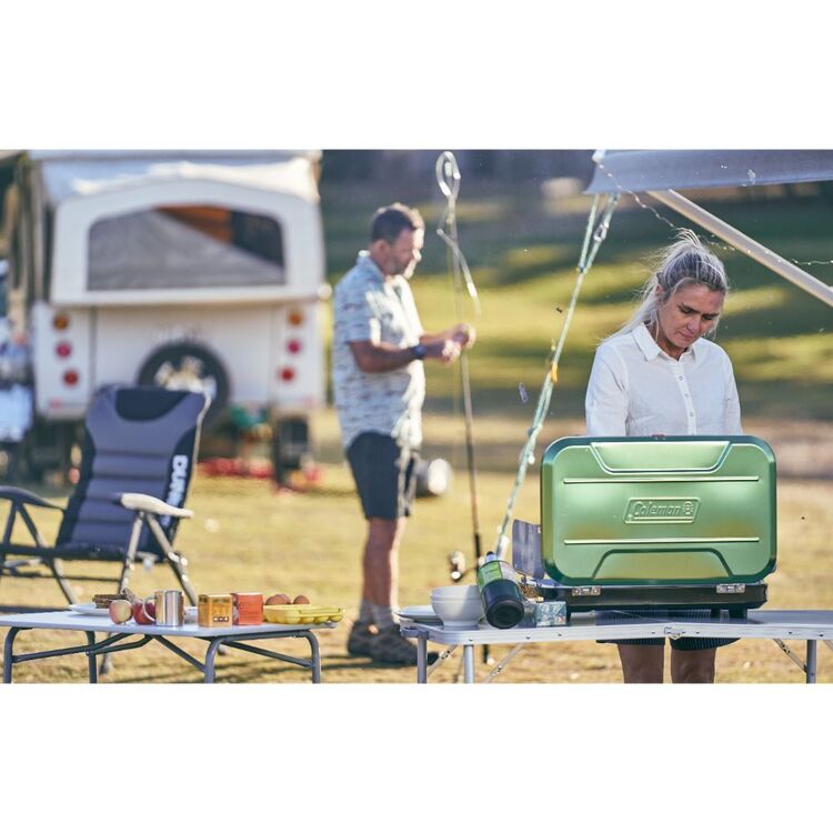 If you’re after an outdoor stove with an instant start push-button that is easy to use, then the Coleman 3-Burner EvenTemp Stove is for you! Battery InstaStart electronic ignition with PerfectFlow propane control system means you can simmer, boil, deep fry or stir fry to perfection. The Coleman EvenTemp 3-Burner Propane Stove features two 11,500 BTU burners, and one 5000 BTU burner for a total of 28,000 BTUs of fully adjustable cooking power, that can last for 4.5 hours on low. Cooking’s a breeze with the Wind Block system that shields the three burners from the wind and doubles as side tables for dishing up. A heavy duty easy-clean griddle and grease cup and a 5 foot LPG hose are all included.