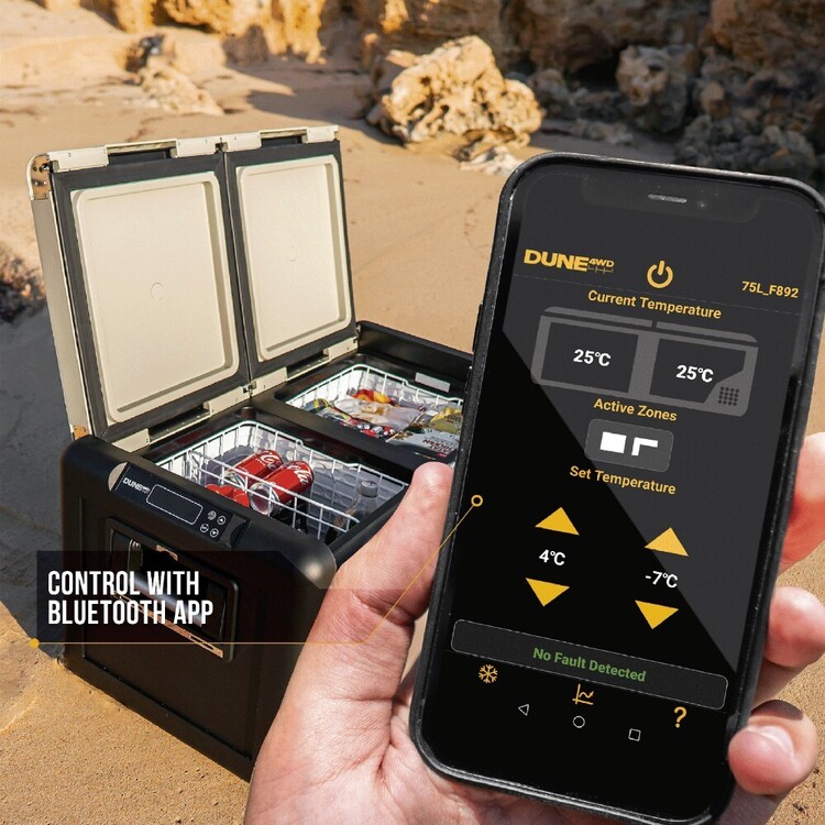 Our uniquely designed “tie-down plate” is built into the fridge unit and does not require extra parts or installation to operate. Simply feed your tie down straps through the slots and attach to your fridge slide to secure your fridge during transport. Built from thick stainless-steel plate, the tie-down plate comes standard with every model in the range. Our custom-designed Dune 4WD Fridge/Freezer Bluetooth app allows you to change the temperature, review the performance, access the manual and more. These features make the Dune 4WD 75L Dual Zone Fridge/Freezer a great choice for anyone who wants a reliable, durable, and versatile fridge for their next camping trip. So, whether you’re heading to the beach, the bush, or the mountains, the Dune 4WD camping Fridge /Freezer will keep your family’s food and drinks cold and fresh.
