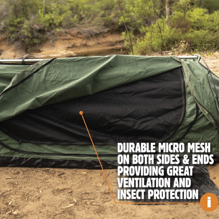 Experience unparalleled relaxation on the 50mm high-density foam mattress, complemented by a cover for added durability. This compact single swag comfortably sleeps one adult and offers excellent ventilation through strategically placed mesh windows and no-see-um mesh doorways on both sides of the swag keeping you comfortable while protecting against insects. Enjoy expansive views, this swag offers an unparalleled visual feast, allowing you to experience the beauty of the outdoors from every angle.