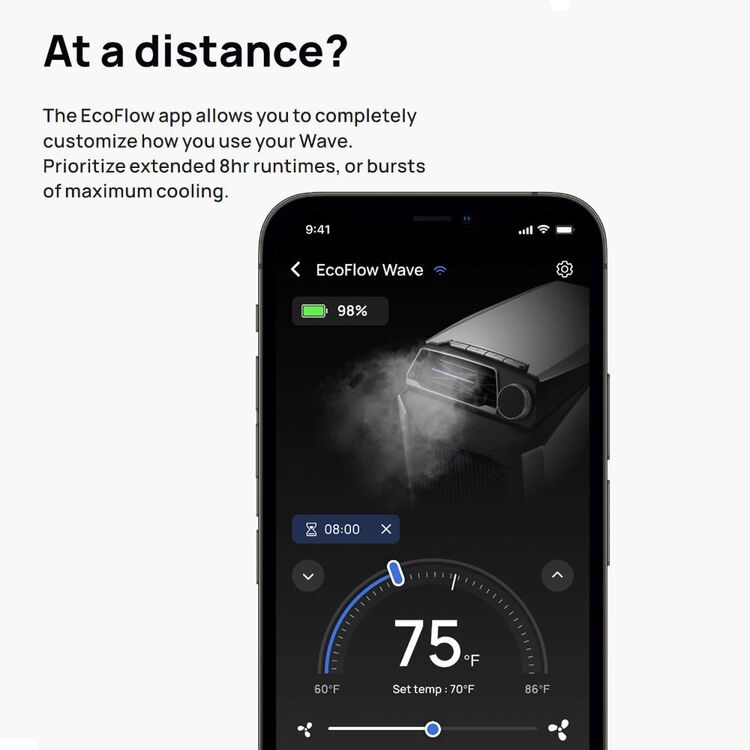 The EcoFlow app allows you to completely customize how you use your Wave by prioritizing extended 8hr runtimes, or bursts of maximum coolingWiFi: Supported