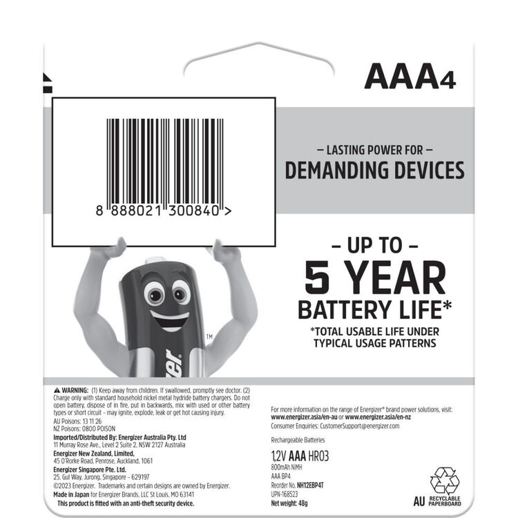 Keep your family fully powered every day with the best performing, long-lasting Energizer Rechargeable 800mAh AAA Batteries 4 Pack. Pre-charged and ready to go when they arrive on your doorstep, these rechargeable batteries help you save money and create less waste over time, reducing environmental impact. Simply pair up with any Energizer Recharge Charger to power up your most essential devices like digital cameras, handheld GPS, and wireless gaming systems and keep the power going. Don’t leave yourself in the dark and without an alternative power source, check out the full Energizer range online or in-store today at Anaconda.