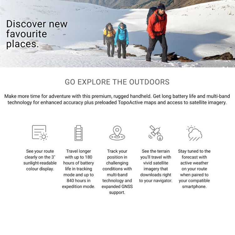 Go explore the outdoors with the GPSMAP? 67 handheld. This premium, rugged handheld offers multi-band technology and expanded GNSS support for enhanced accuracy in challenging environments. Plus, it has a 7.6cm (3″) colour display, with up to 182 hours of battery life in standard mode and 840 hours in expedition mode. Collect your own with Anaconda’s click and collect or order online today!