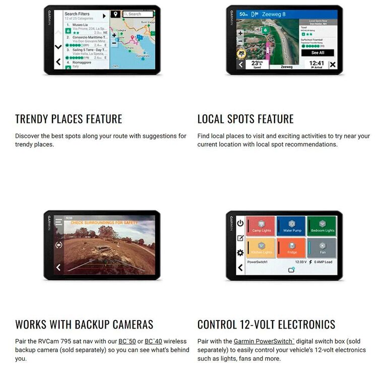 The Garmin RVCAM 795 7″ Camper GPS Satellite Navigator with Built-in Dash Cam adds a built-in dash cam to serve as an eyewitness during your adventure. It continually records and saves video of detected incidents and the camera allows forward collision and lane departure warnings to increase situational awareness.