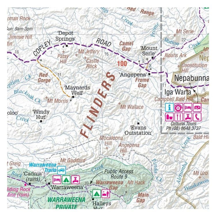 A waterproof map of the Flinders Ranges with inset national park maps of Flinders Ranges National Park and Vulkathunha-Gammon Ranges National Park. Visitor information for both the national parks, the Leigh Creek region and the Blinman region make trip planning and navigation simple, with accompanying tourist information including self-drive treks, historic sites, necessary contact details and listed national parks and reserves. Marked on the maps are camping areas, points of interest and more.