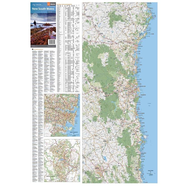 A state map of New South Wales (NSW) at a scale of 1:1,500,000. Marked on the map are national parks, points of interest, 24-hour fuel in addition to camping and rest areas. On the reverse side are CBD maps of Sydney and Canberra, as well as a Sydney regional map, a Sydney throughroads map, and maps of Blue Mountains National Park and the region between Katoomba and Wentworth Falls. There is a full index included, as well as all national park information.