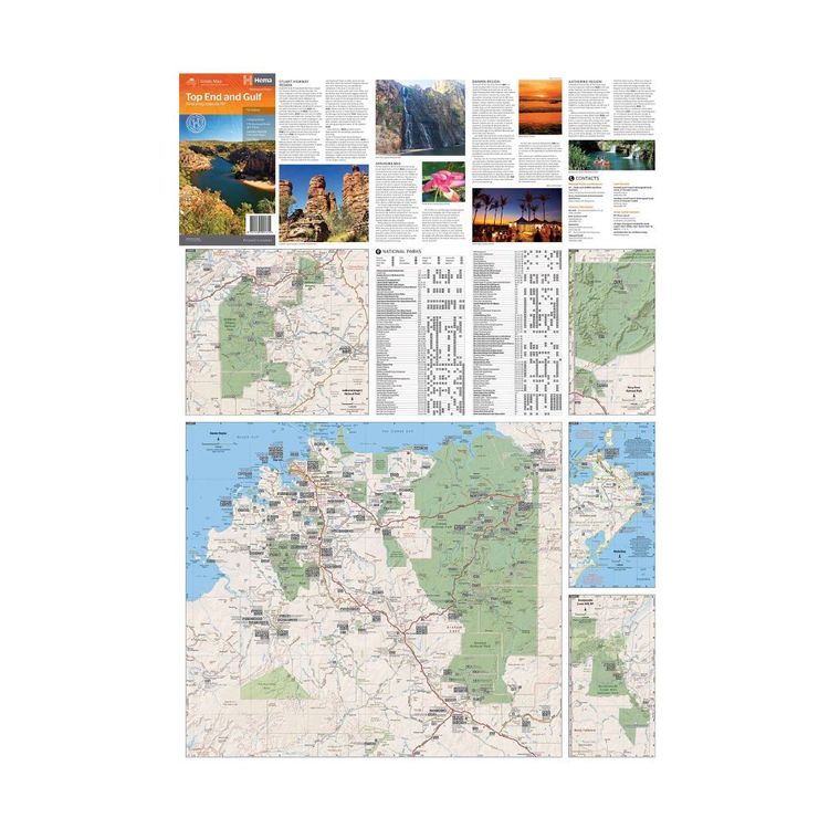 A regional waterproof map of the Top End and Gulf for discovering the region by 4WD. Combining with the main map are inset maps of the Darwin region, Gregory National Park, Nhulunbuy, Keep River National Park and Boodjamulla (Lawn Hill) National Park. There is additional tourist information for Arnhem Land, the Roper River trek, Darwin region, Douglas-Daly district, Nature’s Way, Victoria Highway, Katherine Region and the Stuart Highway Region. Marked on the map are camping areas, GPS surveyed roads and tracks, fuel, and more information for 4WD tourers.