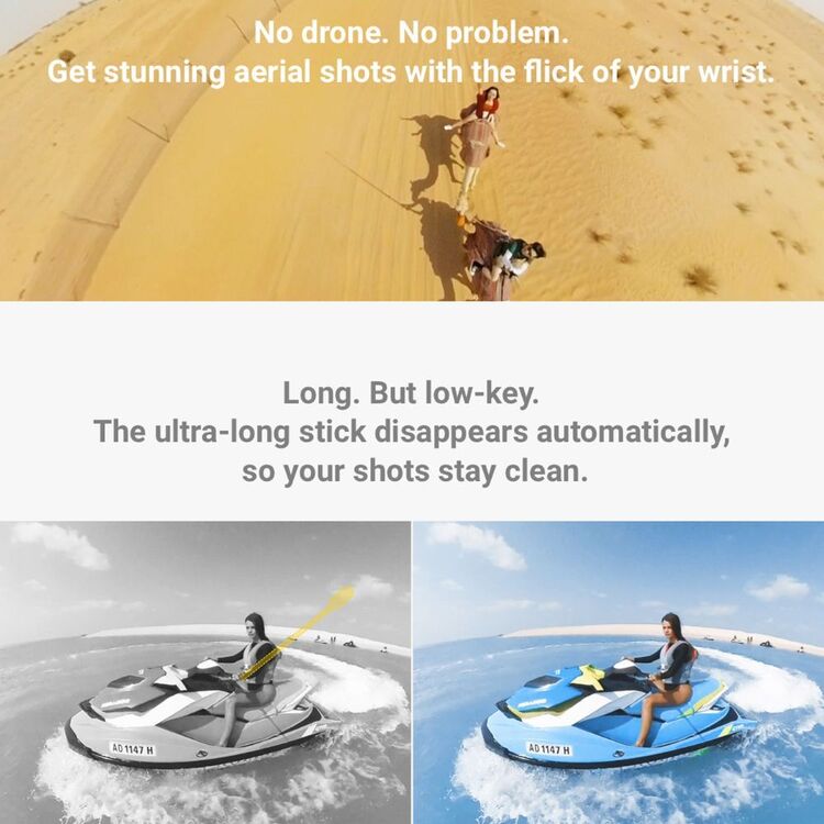 Don’t have a drone? Get stunning aerial shots with the flick of your wrist with the Insta360 Extended Edition Selfie Stick. This ultra-long selfie stick is lightweight yet sturdy with a bend-resistant build. It is extendable up to 3 metres and allows your ONE X2, ONE R 360 Mod, and ONE X to remove the selfie stick in your shots, providing you with unobstructed, clean and smooth video at impossible angles. It is made with military-grade carbon fibre and aluminium and features standard 1/4 inch mounts on both ends.