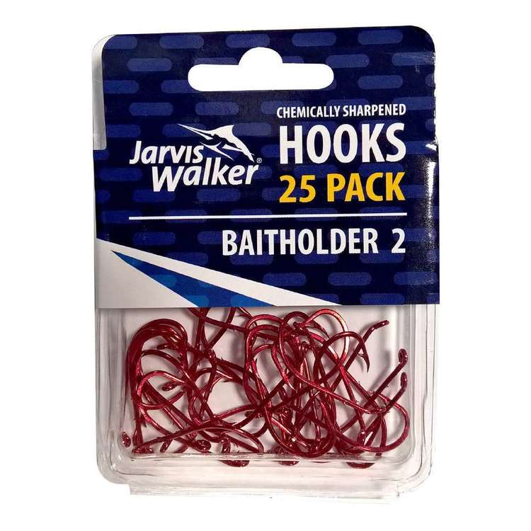 Jarvis Walker Baitholder Red Chemically Sharpened Hook Packs contain 25 of the highest quality red chemically sharpened hooks. Jarvis Walker Baitholder Red Chemically Sharpened Hook Packs feature a chemically sharpened point and two notches on the shank to hold baits in place for the perfect presentation.