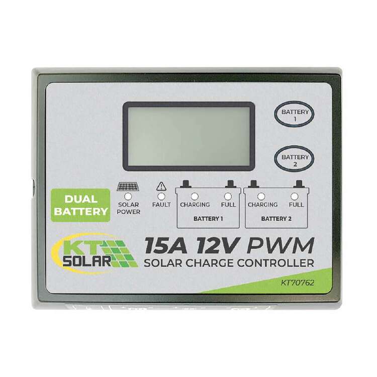 The KT 15 Amp Solar Controller is designed to charge 2 x 12V Deep Cycle Batteries simultaneously. Suited to charge Lead Acid, LTO, Gel, AGM, LiFePO4 & Calcium Battery types, this Solar Charge Controller prevents batteries from becoming overcharged. The unit provides an automatic equalisation feature for deeply drained conventional lead-acid or calcium battery.