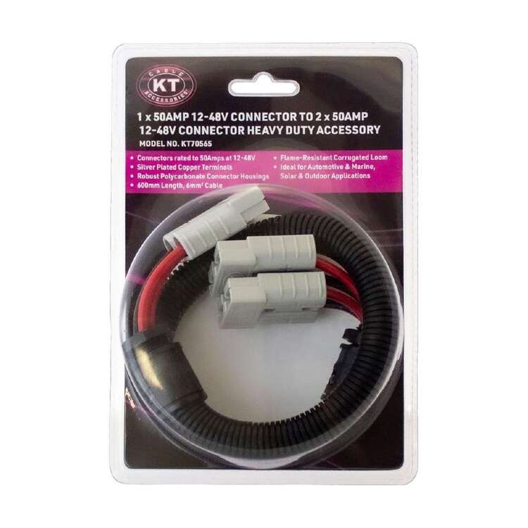 Turn your single 50A Connector into either two outputs or two inputs with this accessory. This lead is connected at one end with a single 50A Heavy Duty Connector which is terminated to two 50A connectors. Now you don’t need to run another cable from the battery and can simply add an extra input/output with this clever lead.