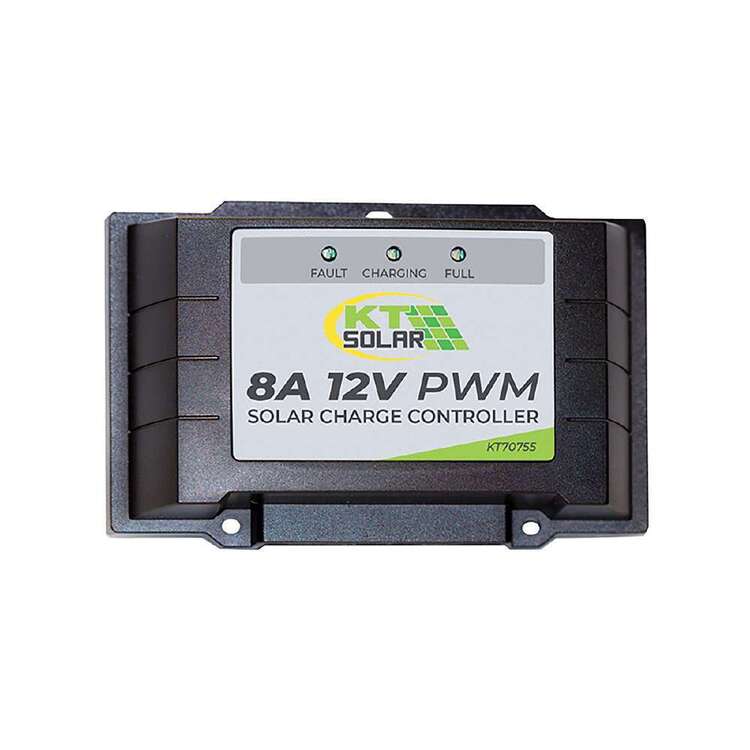 The KT 8 Amp Solar Charge Regulator is designed to regulate the amount of charge coming from the panel that flows into the deep cycle battery in order to avoid batteries being overcharged. The regulator can also provide a direct connection to appliances, while continuing to recharge the battery – i.e. you can run appliances directly from it, bypassing the battery bank – however the batteries will continue to be charged.