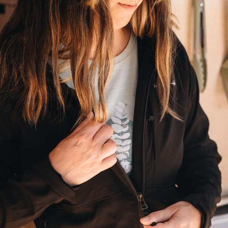 The Mountain Designs Charlotte softshell jacket is a versatile choice whether venturing abroad, exploring trails or just getting around town every day. It provides lightweight wind resistance in cool, breezy conditions, has a Durable Water Repellent (DWR) finish for handling light rain, and offers breathable performance for practical, everyday wear. The articulated elbows work with your arms as they move, and you can easily adjust the hood, wrist cuffs and hem to suit your style and get the best fit. For convenience it packs away into its left-side hand pocket when you don’t need a blocking layer, and multiple pockets keep your personal items safely tucked away.