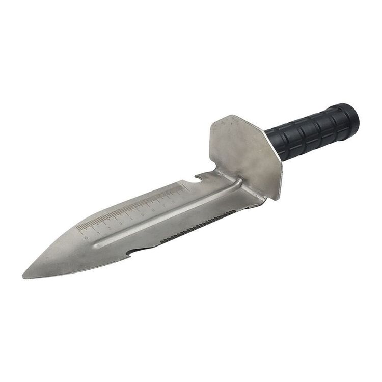 The Prospecting Stainless Steel Edge Digger Tool helps to easily break through and loosen hard soils, roots and rocks, with the option of straight and serrated edge blades to suit a range of terrains. This tool is fitted with a 10cm ruler on the blade as a depth guide, and features an oversized comfortable grip with steel hand guard to protect the hands while digging. Constructed with heat treated stainless steel and coming with a handy sheath with belt loop, this tough digger is built to last for any prospecting adventure.