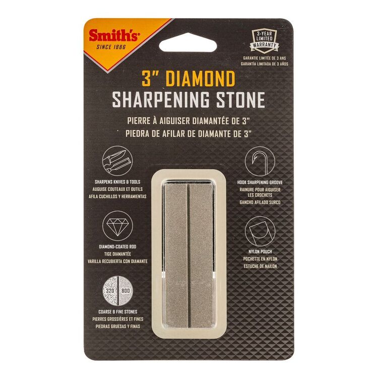 Smith’s 3″ dual grit diamond stone is perfect for sharpening any knife, large or small. It comes with a fabric storage pouch, which features a fold-over flap and belt loop. The stone features a V-shaped groove great for sharpening fish hooks. These extremely fast honing 320 and 800 grit diamond stones will quickly sharpen anything with a cutting edge including high carbon and stainless steel knives. Shop in-store or online with Anaconda today to find everything you need for your next fishing trip!