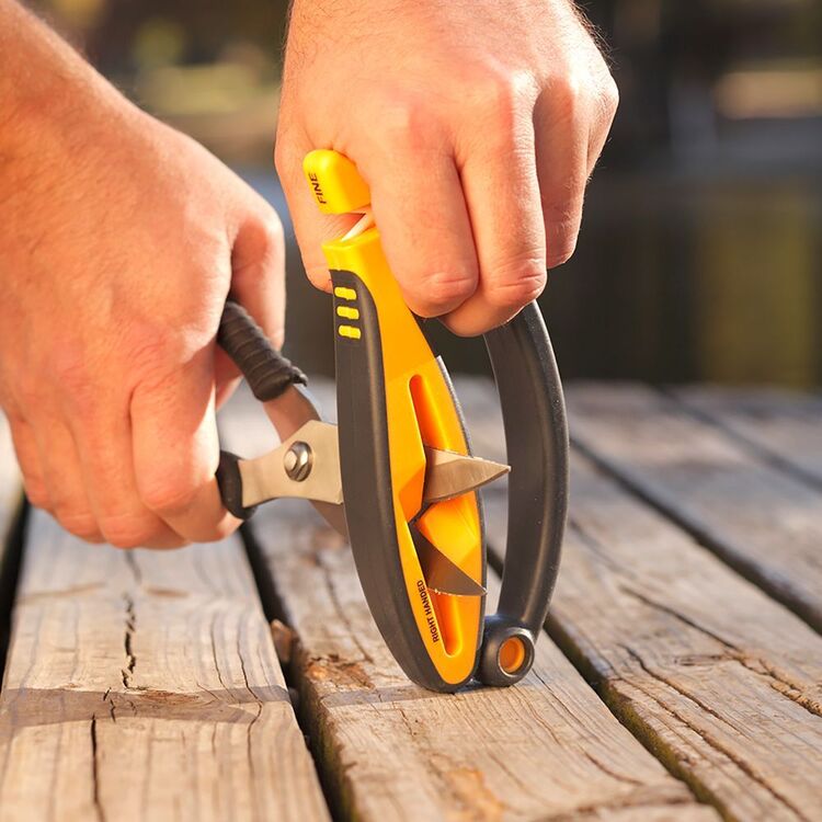 Simple and dependable, the JIFFY-Pro Handheld Sharpener is quick, safe, and easy to use in the field, back at camp, or in your home. The knife sharpening slots incorporate crossed carbide blades used to set the edge on your extremely dull or damaged blade and crossed ceramic rods used for honing the final edge to razor sharpness. These fixed abrasive components create a preset sharpening angle that guarantees results every time no matter where you are sharpening your knife. The scissors sharpening slot in the handle of the JIFFY-Pro has been enlarged to accommodate game shears as well. It uses a patented, floating carbide rod that adjusts to fit the precise bevel of the blades and has a soft grip rubber handle for a firm, comfortable grip in all conditions. Shop in-store or online with Anaconda today to find everything you need for your next fishing trip!