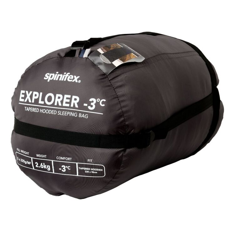The Spinifex -3��C Explorer Hooded Sleeping Bag is perfect for the camper braving frosty weather, with a comfort rating of -3��C. With a comfortable soft lining and water resistant outer shell, this sleeping bag keeps you comfy and dry throughout the night. This sleeping bag sleeps one. Shop quality with the full Spinifex Explorer range – available online or in-store at Anaconda today.