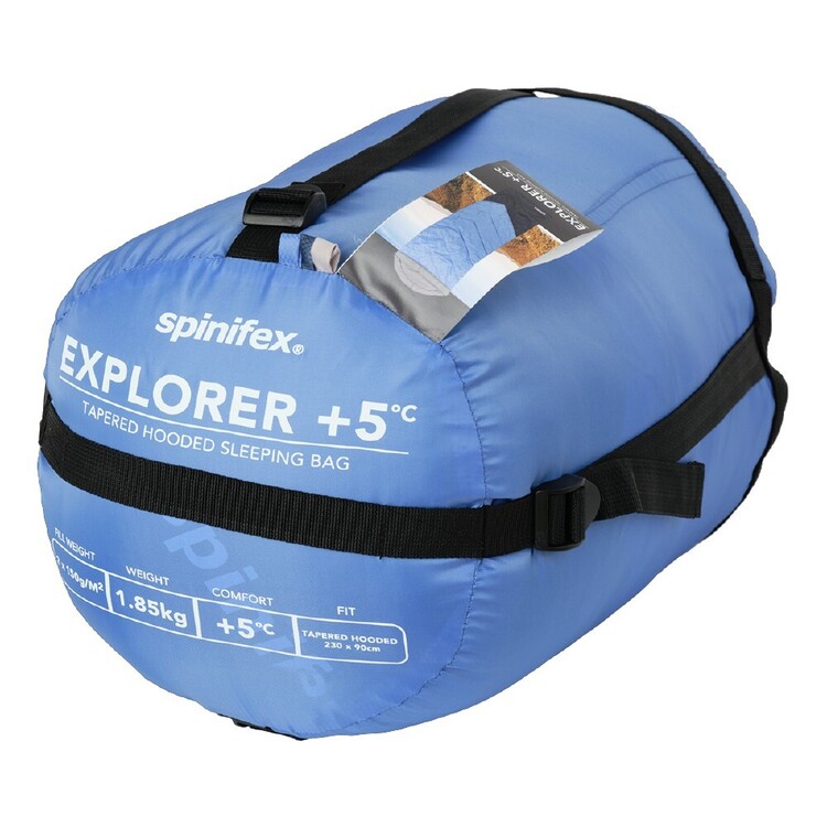 The Spinifex +5��C Explorer Hooded Sleeping Bag is perfect for the amateur camper looking to keep warm as the night grows colder. With a comfortable soft lining and water resistant outer shell, this sleeping bag keeps you comfy and dry throughout the night. This sleeping bag sleeps one. Need an alternative comfort rating? Shop the full Spinifex Explorer range online or in-store at Anaconda today.