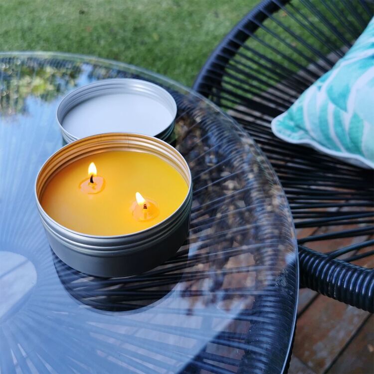 - ? Tropical Strength Portable citronella tin candles convenient pack of 2 tin candles is designed for compact portability when outdoors.