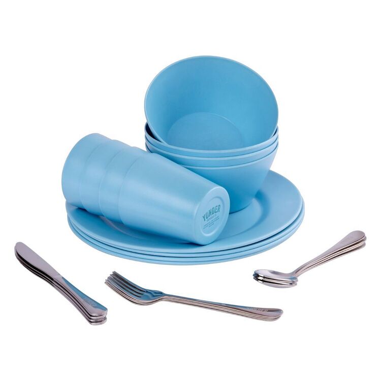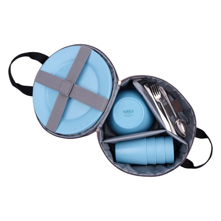 The Yonder Four Person Dining Set is great for feeding the family or fellow campers at dinner time. Everyone can have their own designated cup, fork, spoon, knife, plate and bowl! The bright colouring makes it easy to spot amongst your luggage and other camping essentials. Pack up and leave no mess with the carry bag provided. This set is available online or in-store at Anaconda today!